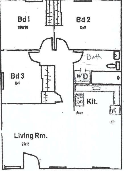 All units have the same configuration with the exception of the kitchen cabinetry layout* Some do not have washer dryer hookups. Units are approximately 950 sq. ft. All units have insulated glass windows. *Note: Depending on unit number the layout would be just the opposite of this sketch.
